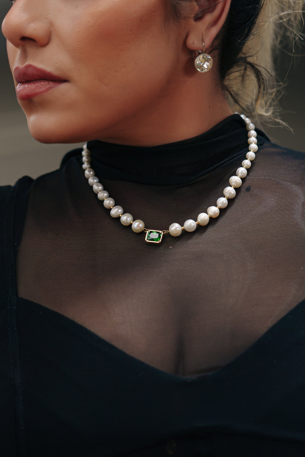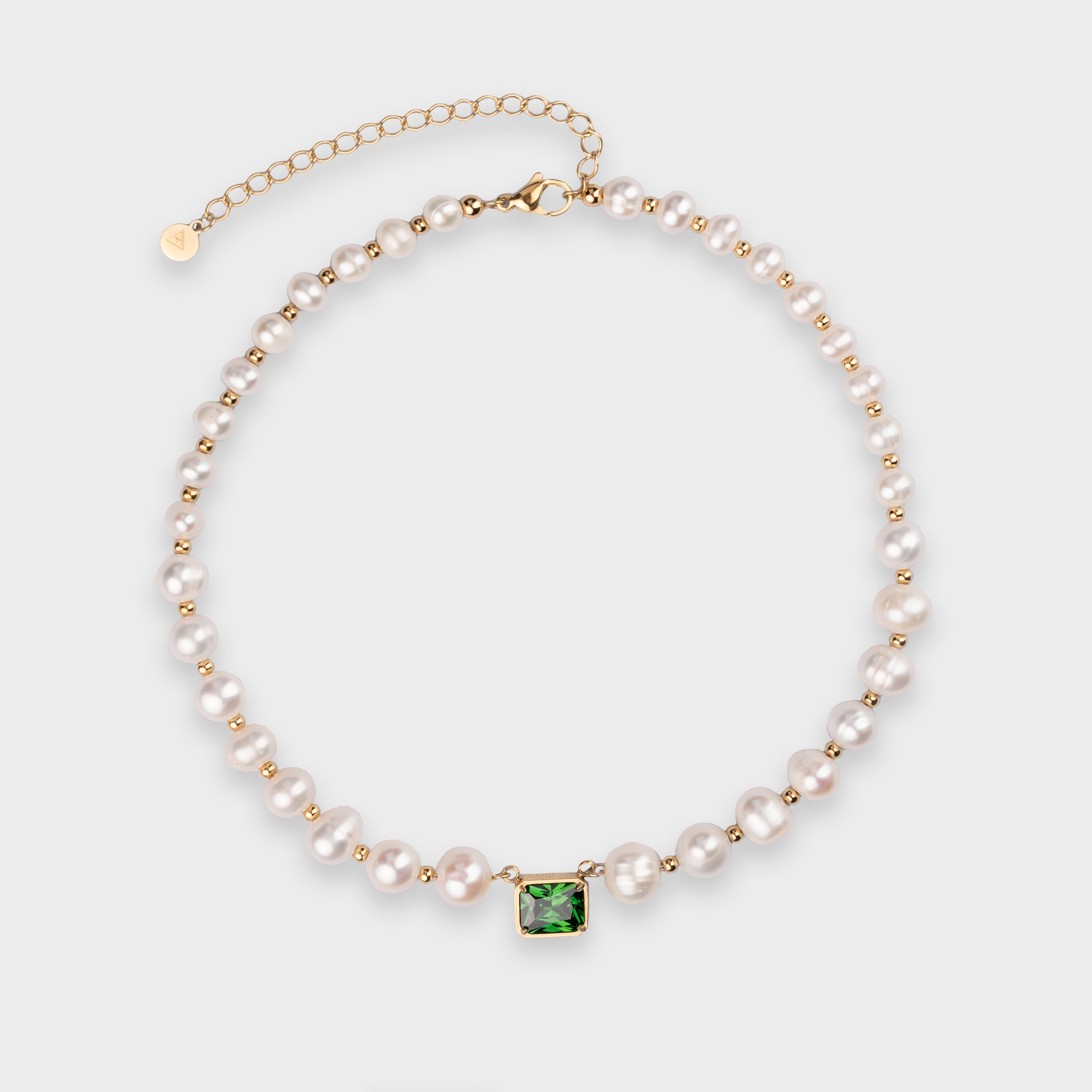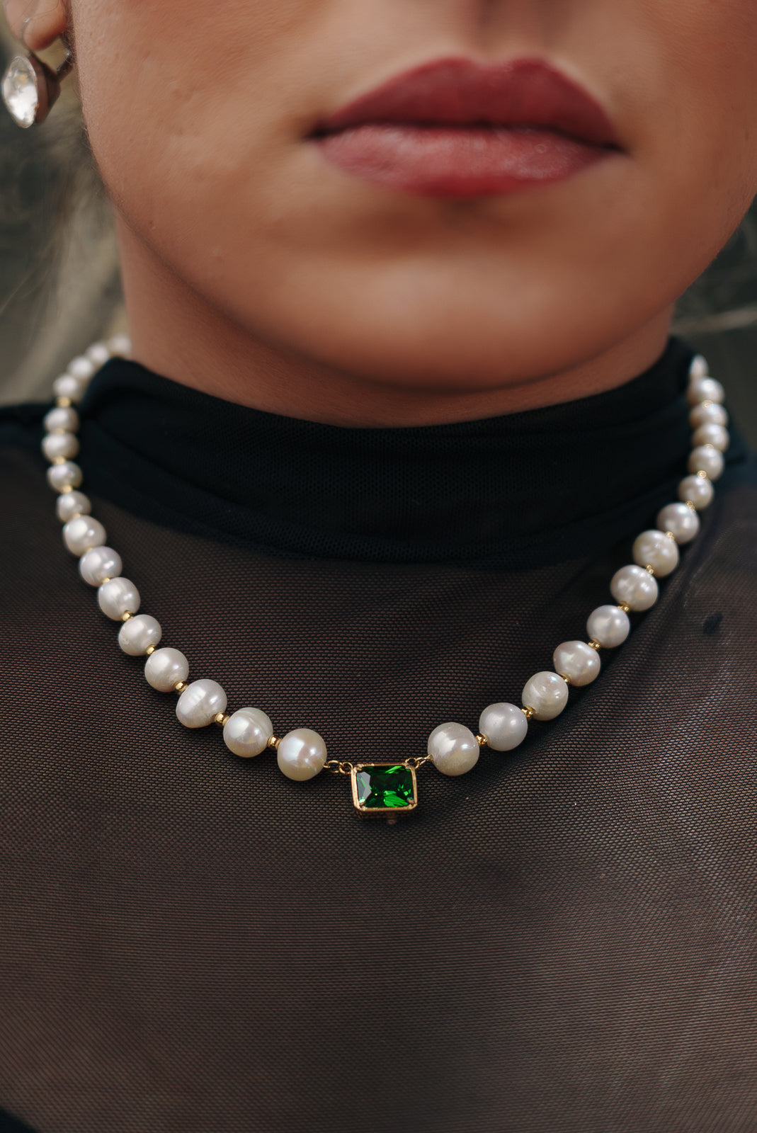 Explore our exquisite pearl collection: a stunning combination of freshwater pearls and a vibrant green gemstone centerpiece. Define your style with this elegant and charming necklace.