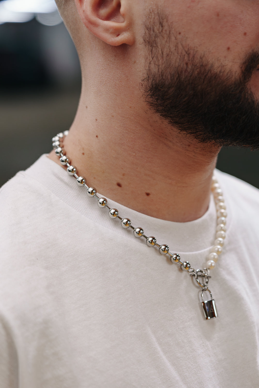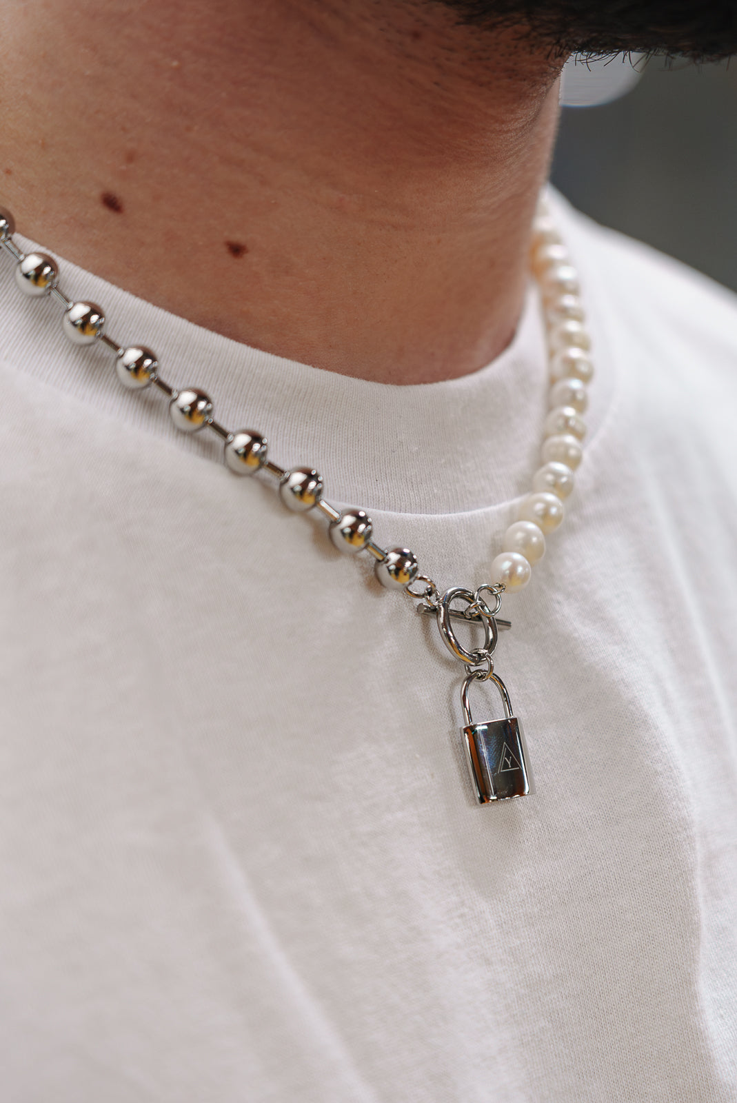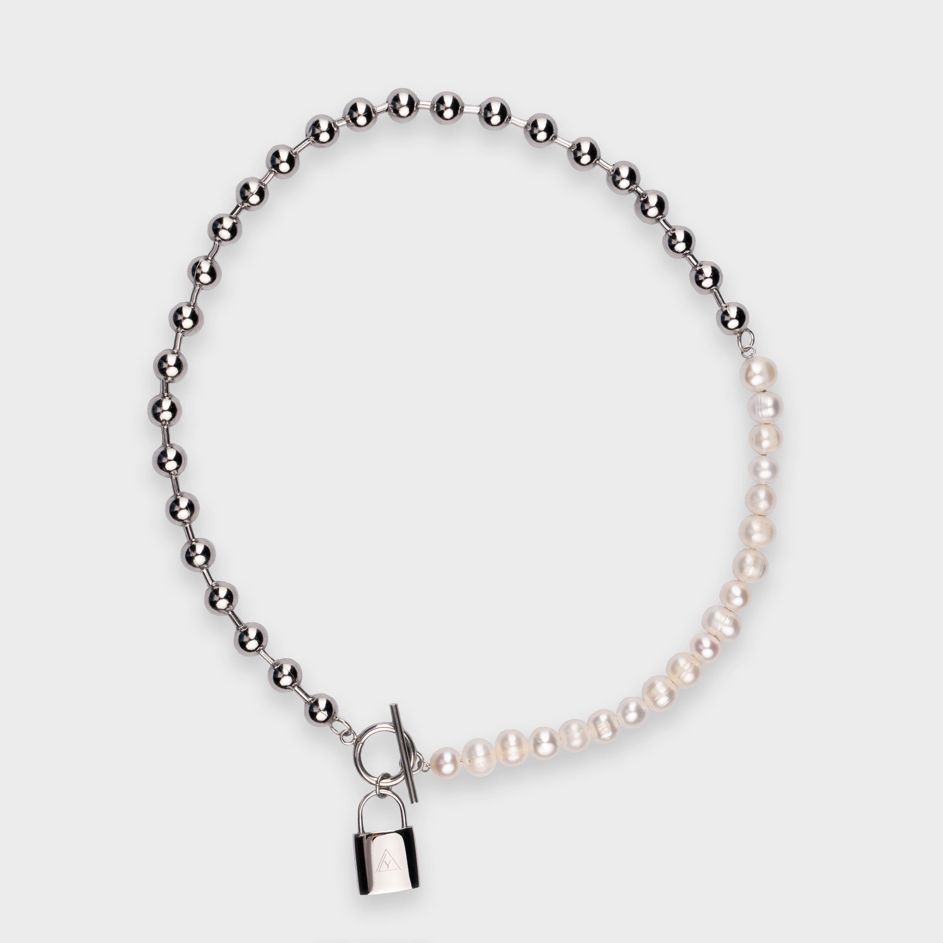 Meet our Ball Lock Freshwater Pearl Chain. This unique piece features half freshwater pearls and half sleek beads, connected by a stylish lock pendant. It's the perfect blend of classic elegance and modern design.