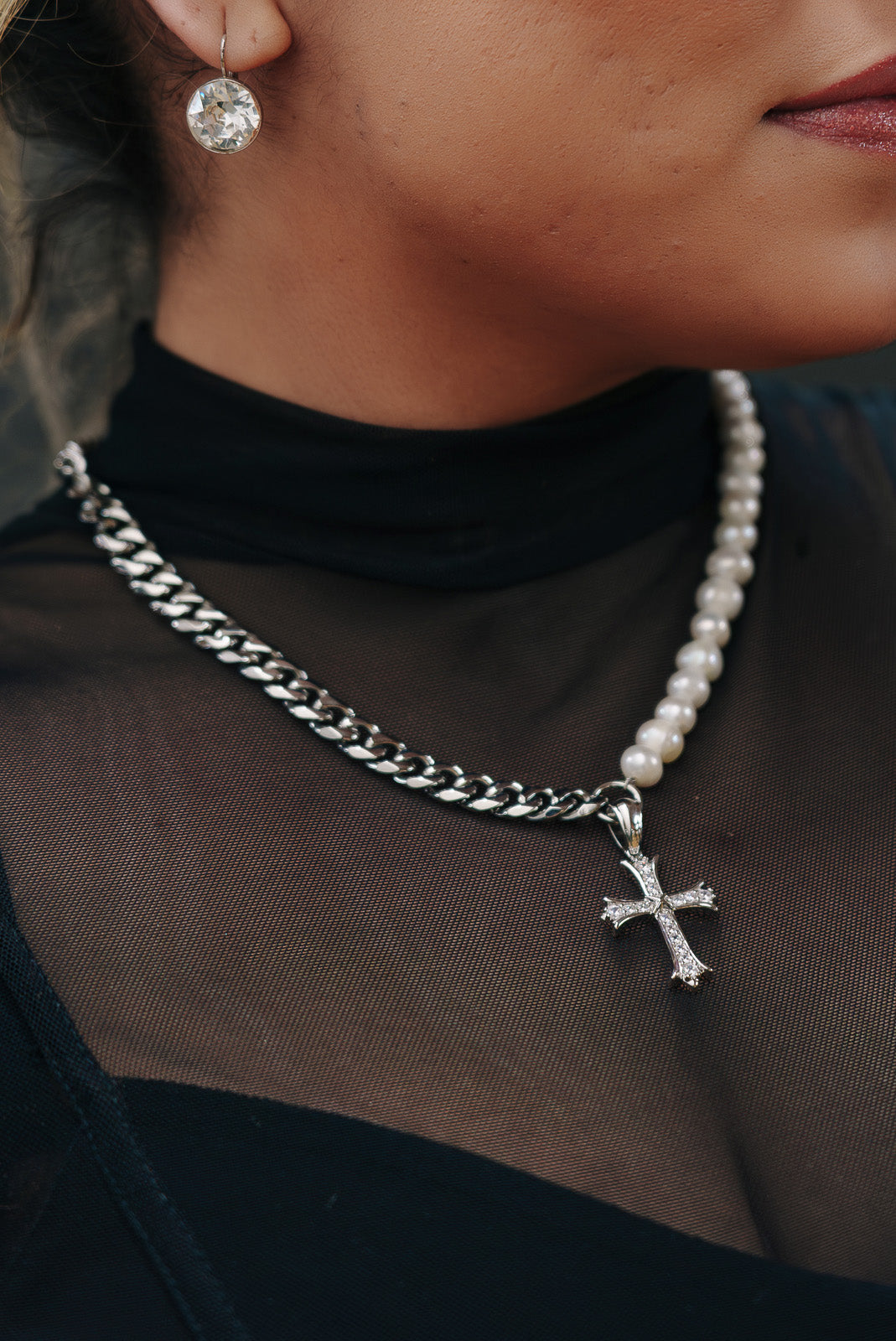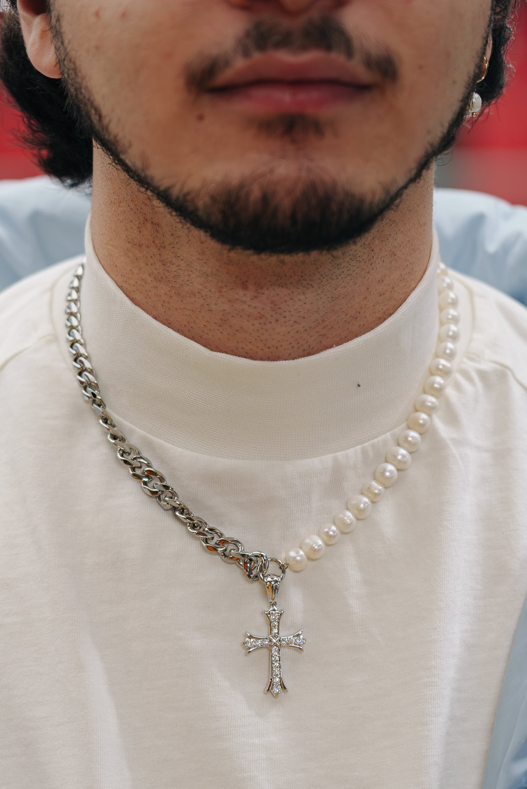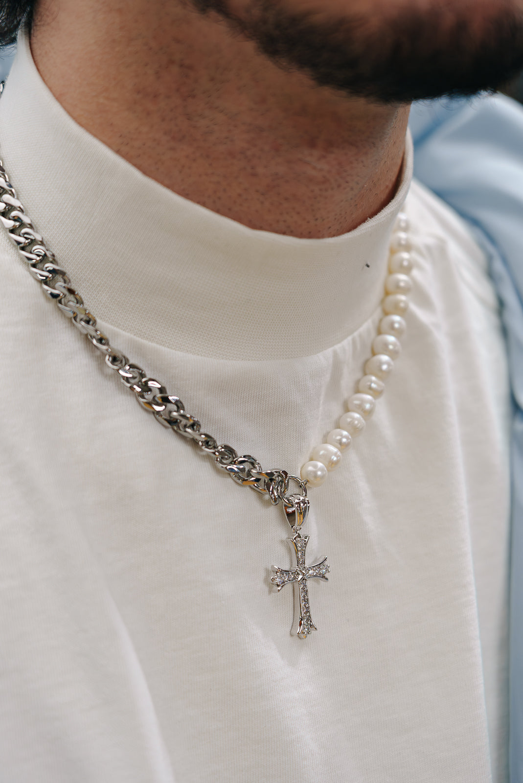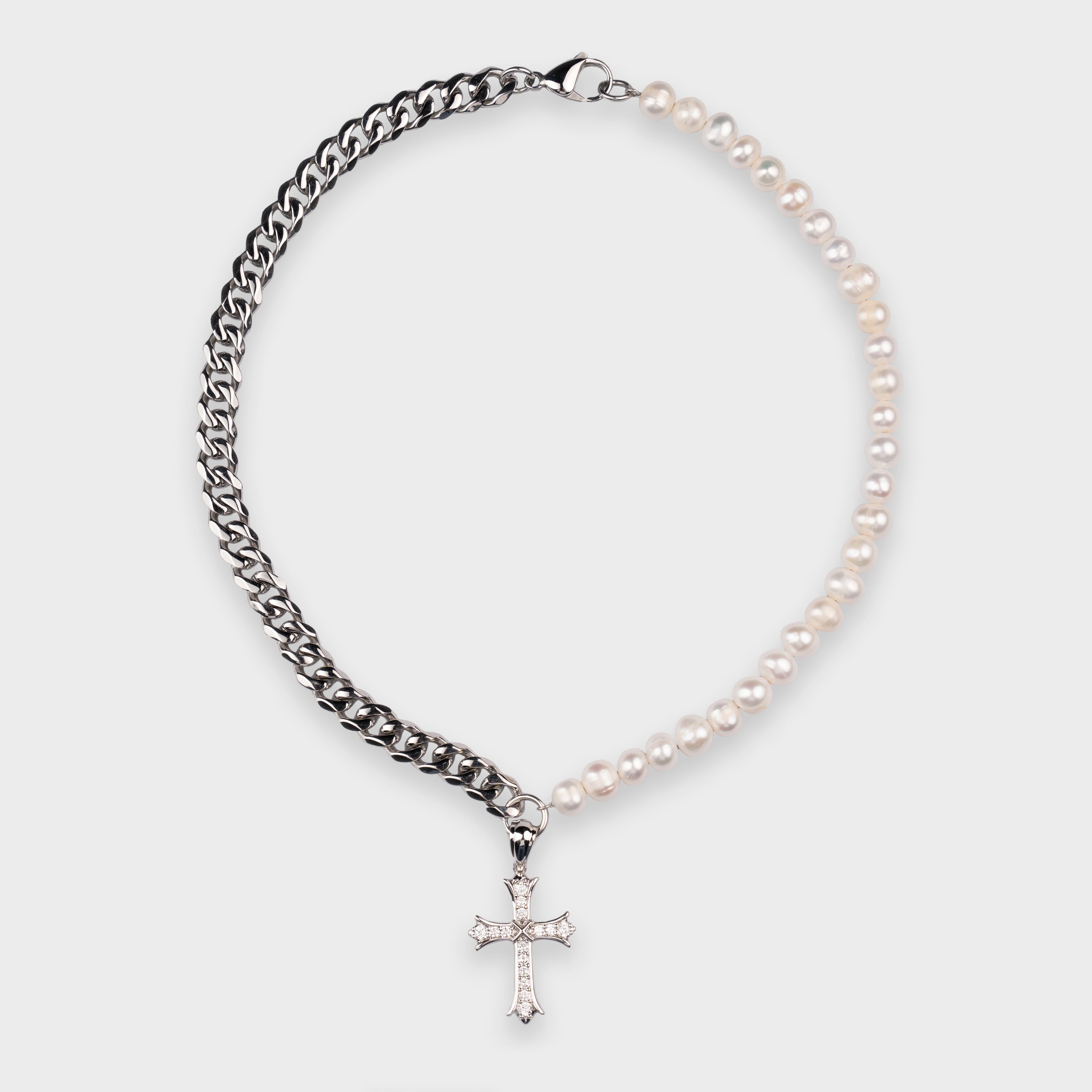 Discover our Cuban link and Freshwater pearl mixed chain, highlighted by a radiant iced out cross pendant. This divine fusion of elegance and spirituality exudes timeless grace, empowering your presence with celestial charm.