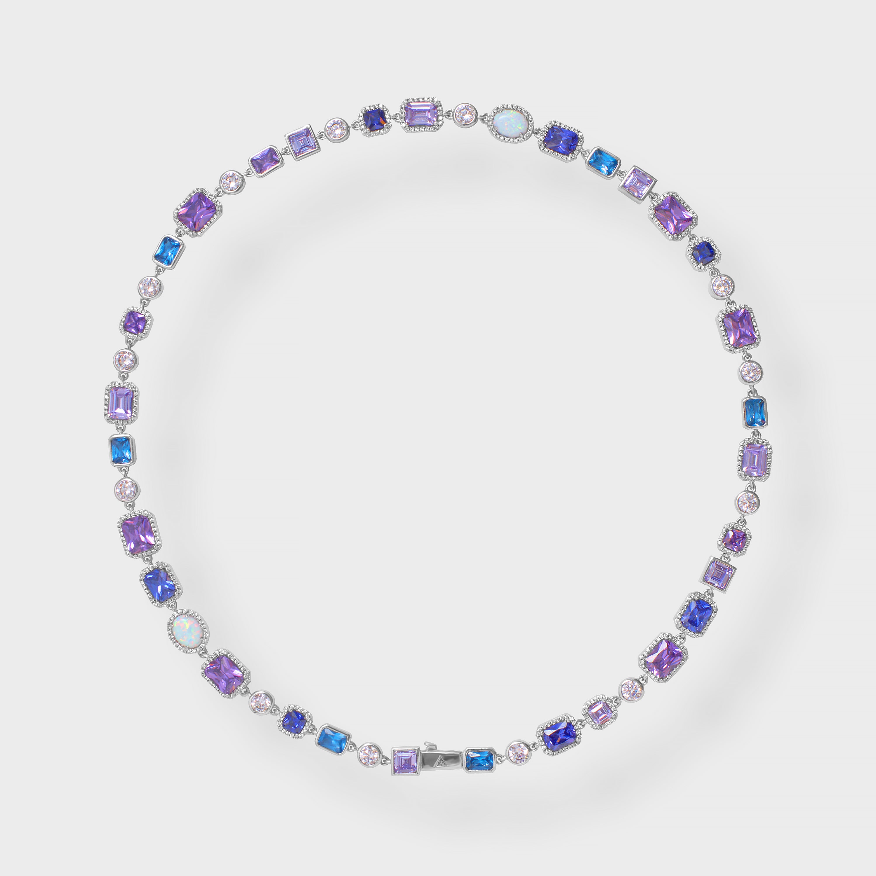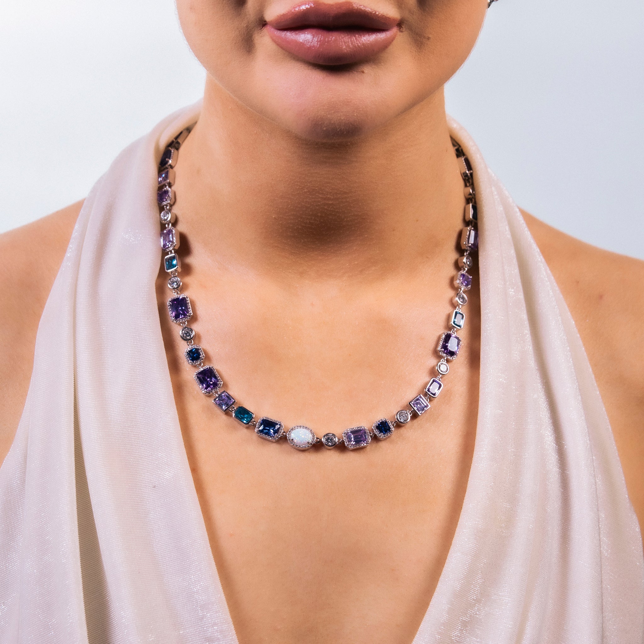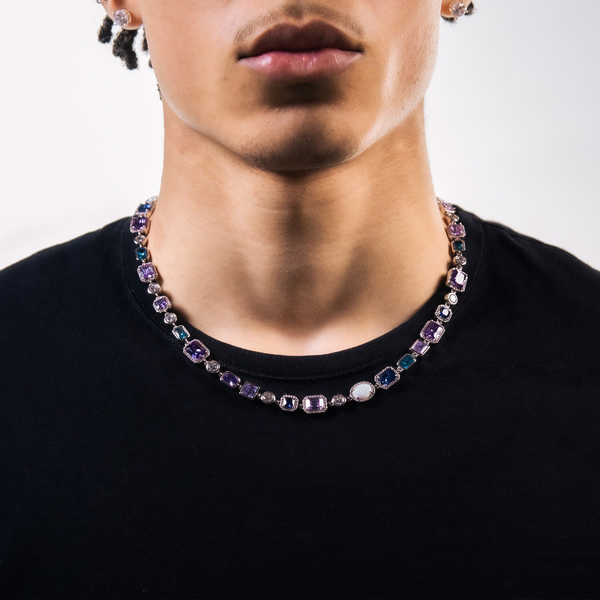 This necklace puts purple gems in the spotlight, mixed with other tones. It's made to bring quiet strength and style to whatever you're wearing.