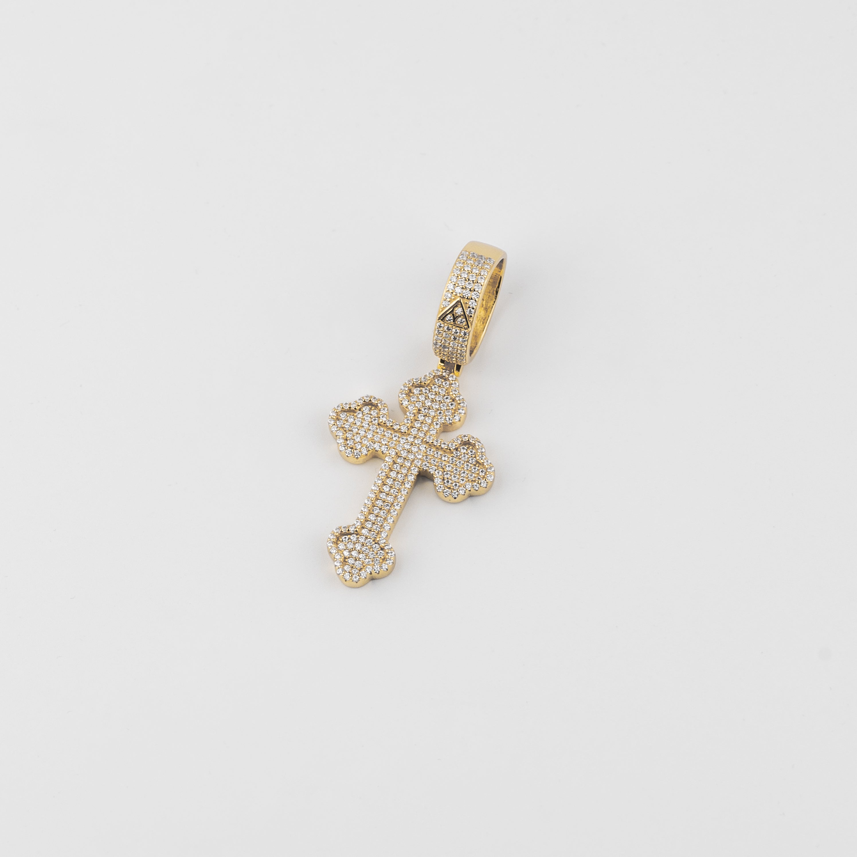 YCIENO Iced Cross Pendant. Crafted from S925 Silver coated in a rich gold finish, this Cross Pendant shines with hand-set stones for a sharp, clean look. Pairs perfectly with our 5mm Tennis Chains or Cuban Links.